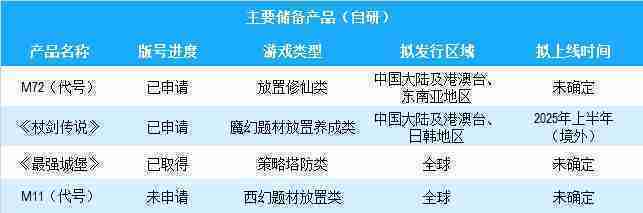 公司有多款储备产品,,,,涵盖放置类、、、策略类、、RPG、、Roguelike等多元化游戏品类,,储备的主要自研和代理产品如下::