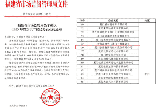 近日,,福建省市场监督管理局公示了2023年福建省知识产权优势企业名单,,,,厦门亚星管理网络技术股份有限公司(以下简称“亚星管理”或“公司”)榜上有名。。